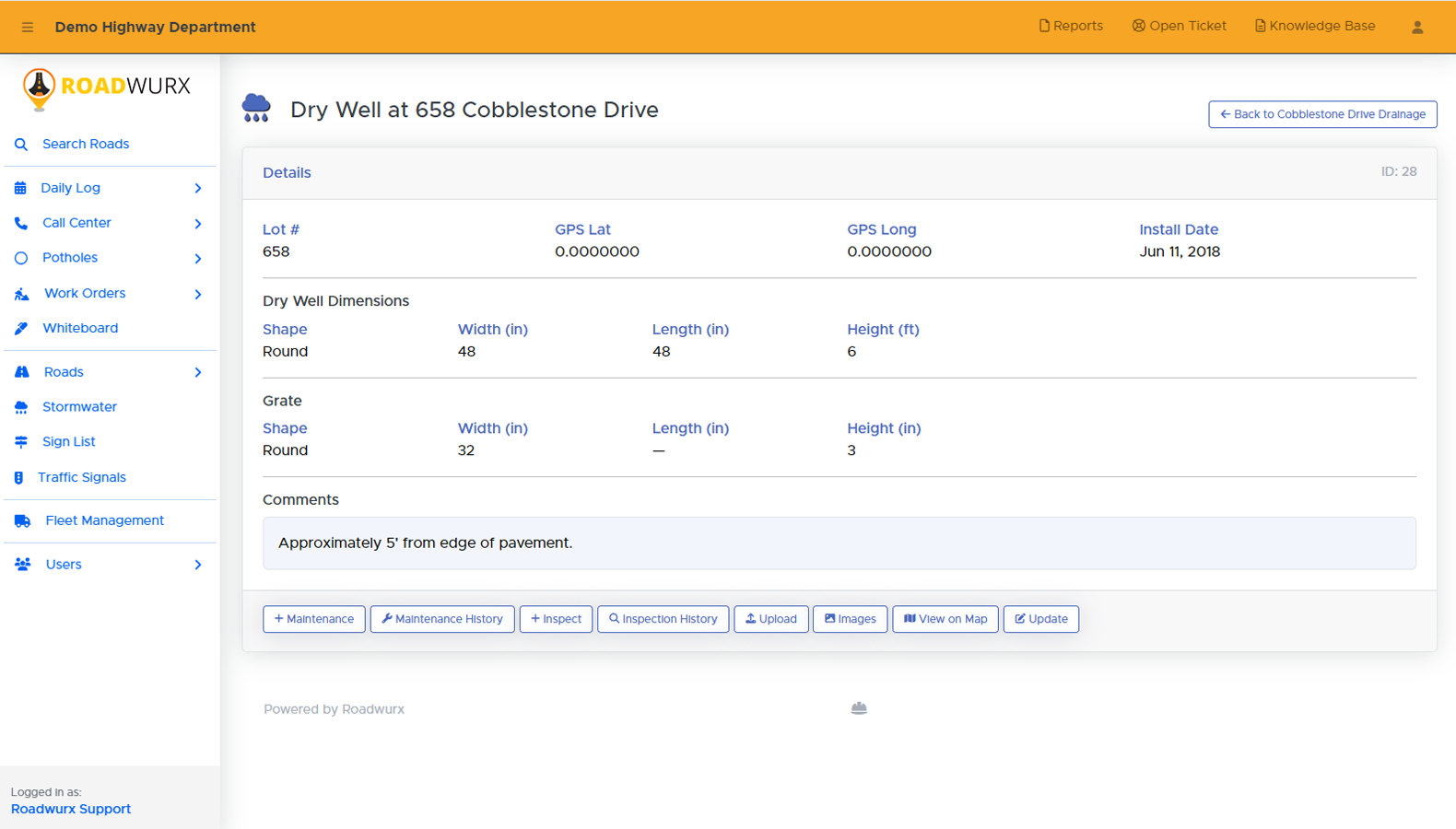 This screenshot is of drywell installation, but other drainage options include catch basins, culverts, ditches, and retaining ponds. With the click of a button, you can list all of the drainage locations for a specific road. You can also add maintenance and inspection events.