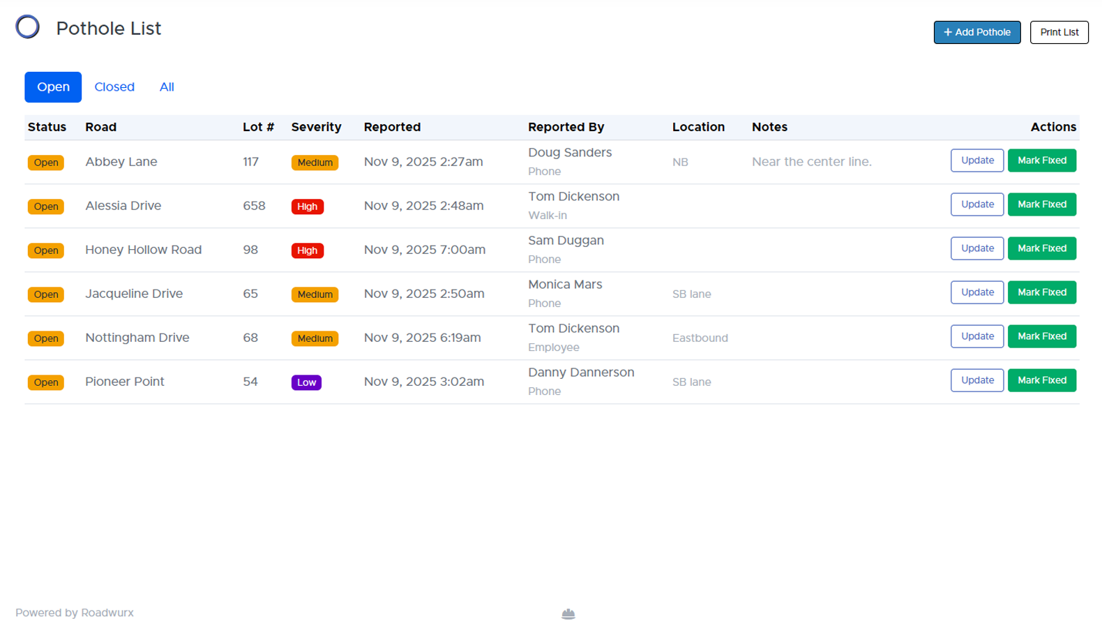 Throw away that notebook you have been recording your potholes in. Roadwurx allows you to easily save reported pothole locations, their severity, and click a button to say that the hole has been filled. You can also click the print button so you have a hardcopy to hand off to your patching crew.