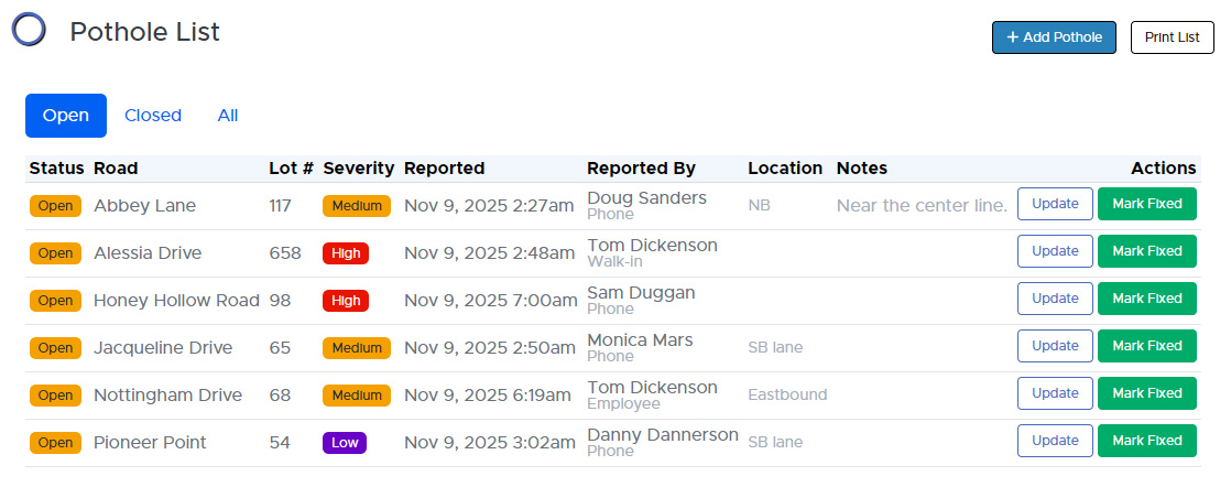 With the Roadwurx Pothole List, managing your daily patching operations is effortless. Each reported pothole appears in a clean, sortable table where you can update details, mark repairs as complete, or print a hardcopy for field crews. Need to review past work? Roadwurx automatically keeps a historical record of all repaired potholes, giving you a clear picture of maintenance trends and helping you demonstrate accountability when questions arise. Every repair, every date, every detail - documented and accessible in one organized system.