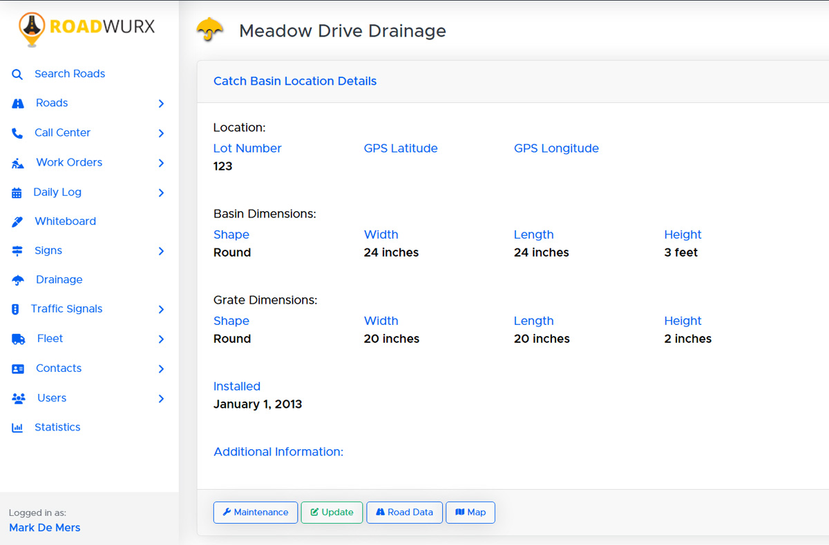 With Roadwurx's asset management platform, you can store vital stormwater installation data, such as location, type of installation (catch basin, drywell, culvert, ditch, retention pond), installation date,