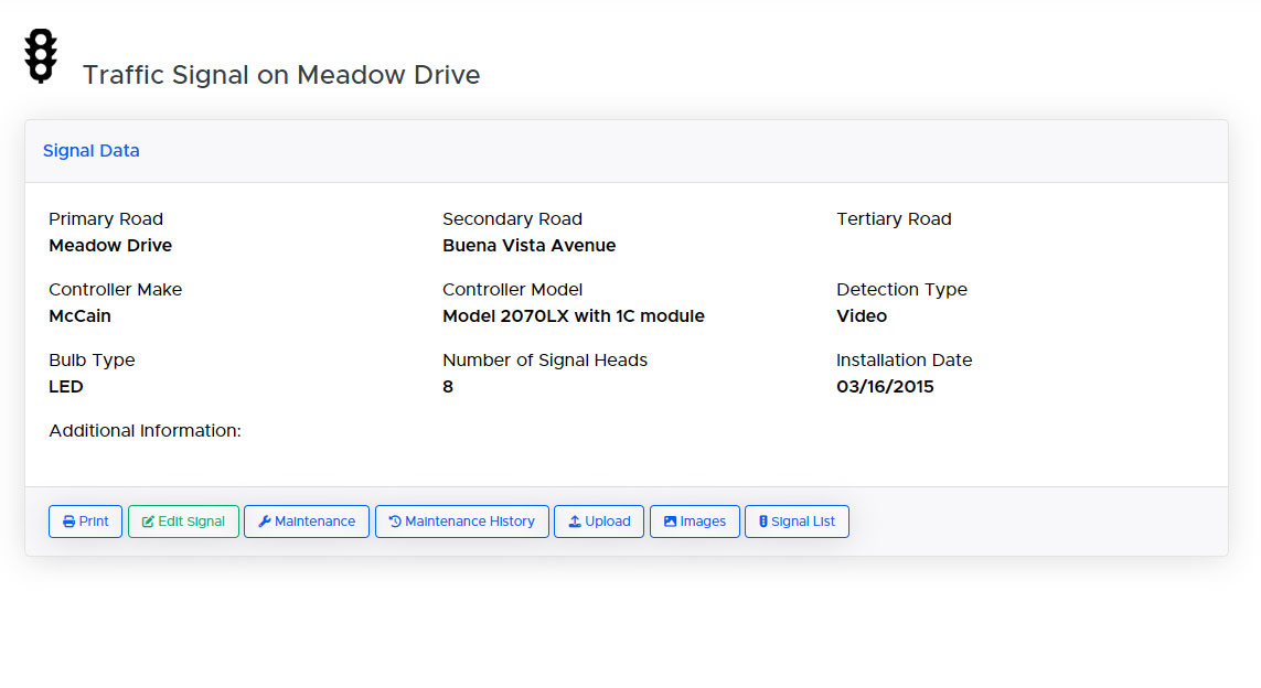 The Roadwurx asset management platform allows you to keep detailed information about your traffic signals. You can name up to three intersecting roads the signal controls, the make and model of the signal controller, the type of bulbs used in the signal heads (LED or incandescent), the number of heads at the intersection, the type of vehicle detection in use, the installation date, as well as any pertinent notes you feel are necessary.